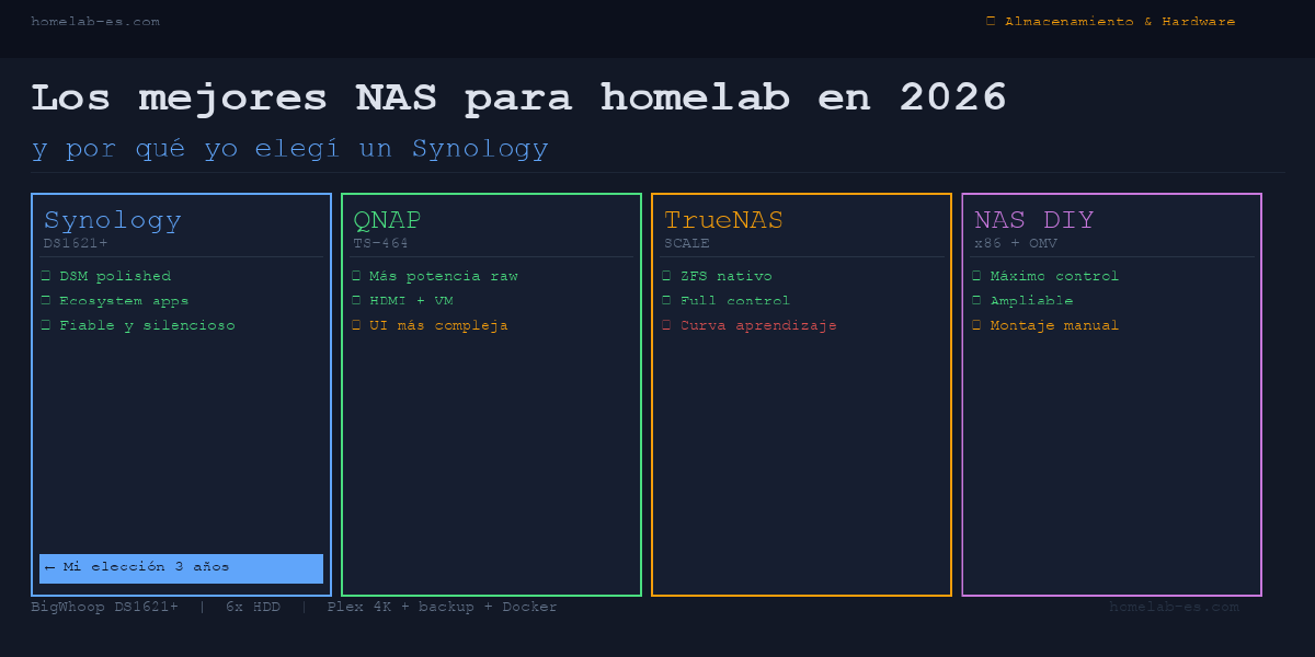 El NAS es de esas piezas del homelab en las que el coste inicial escuece pero luego se convierte en una parte invisible de la infraestructura que simplemente funciona. Vale la pena tomarse el tiempo de elegir bien.