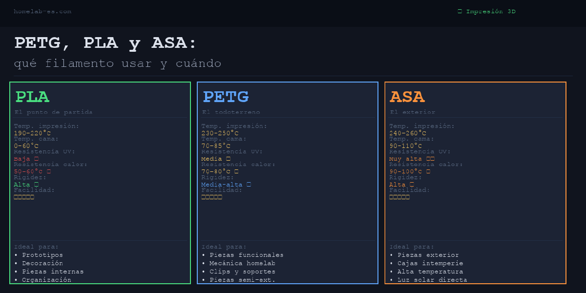 Mi recomendación para alguien que está empezando: domina el PLA primero. Cuando tengas la impresora bien calibrada con PLA, el salto al PETG es relativamente suave. El ASA viene después, cuando ya tienes criterio para diagnosticar problemas de impresión.