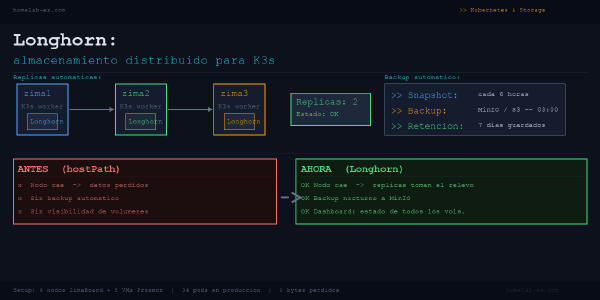 Después de perder datos por un nodo caído, instalé Longhorn en mi clúster K3s. Réplicas automáticas, backups a MinIO y snapshots integrados. Esto es lo que tendrías que saber antes de que te pase lo mismo.